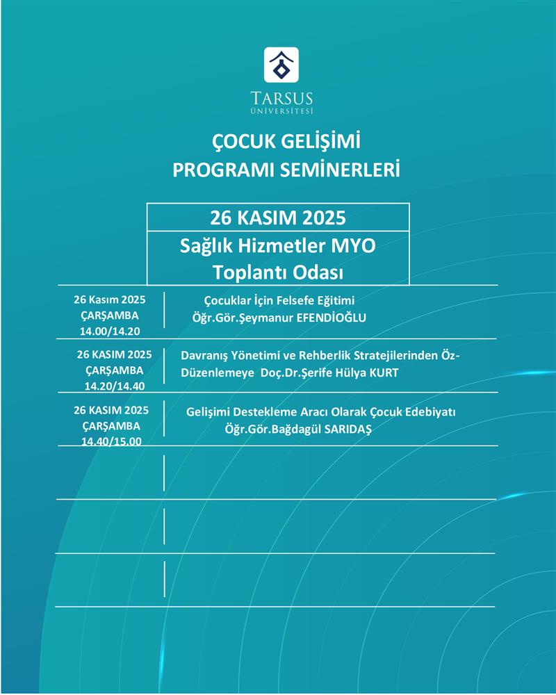 Çocuk Gelişimi programı öğrencilerinin mesleki bilgi ve farkındalıklarını artırmaya yönelik ilk etkinlik 26 Kasım 2025 Çarşamba günü Sağlık Hizmetleri Meslek Yüksekokulu Toplantı Odası’nda gerçekleştirilmiştir. Etkinlik, öğretim elemanlarının sunumlarıyla verimli ve etkileşimli bir şekilde tamamlanmıştır. Program kapsamında;